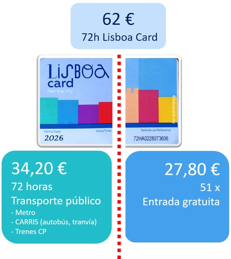 - La Lisboa Card de 72 horas cuesta 62 €, lo que representa un coste adicional de 27,80 € respecto al transporte únicamente.