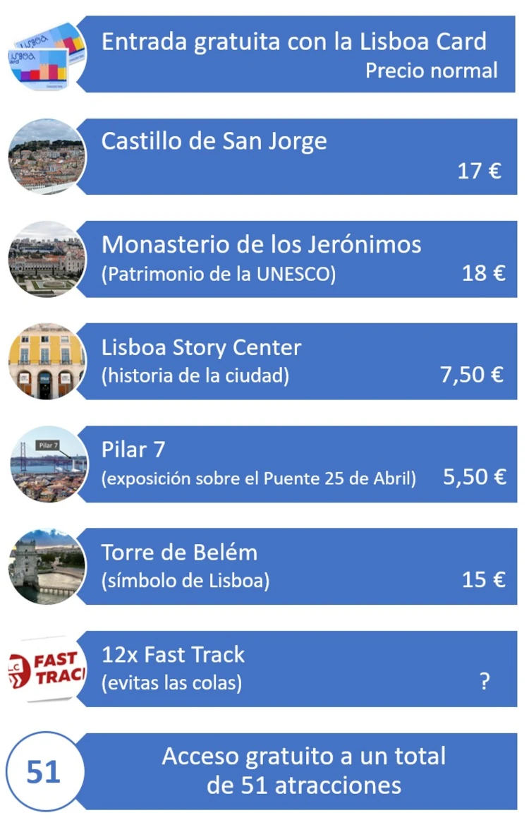 ✅ Si planea visitar varias atracciones en Lisboa, el suplemento de 29 € respecto a una tarjeta de transporte se amortiza rápidamente.