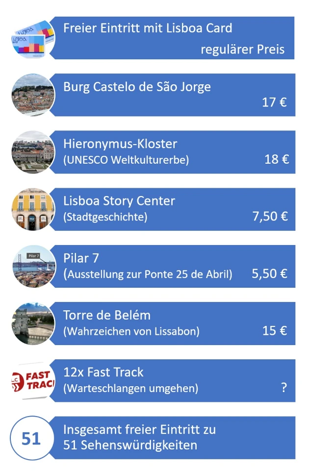 Das Ergebnis: Die Mehrkosten von 27,80 € (Stand 2026) gegenüber der Tageskarte für die öffentlichen Verkehrsmittel (34,20 €/3 Tage) machen sich schnell bezahlt, wenn man einige Sehenswürdigkeiten (z.B. Castelo de São Jorge, Hieronymus-Kloster …) in Lissabon besuchen möchte.
